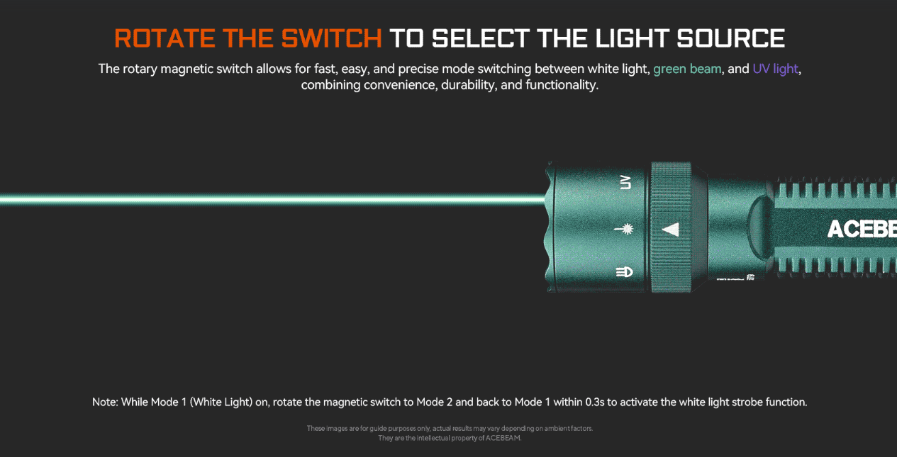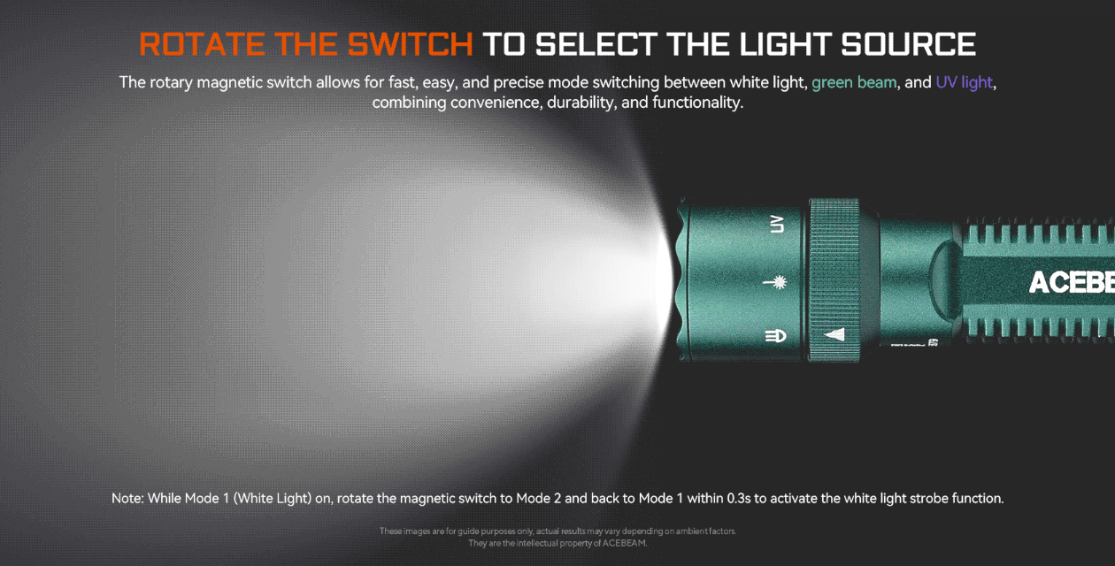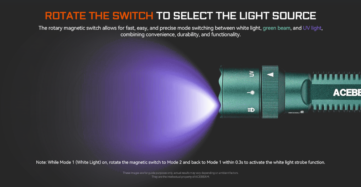- 鏇轉磁吸開關:快速切換白光/綠光/UV光,精準不卡頓;