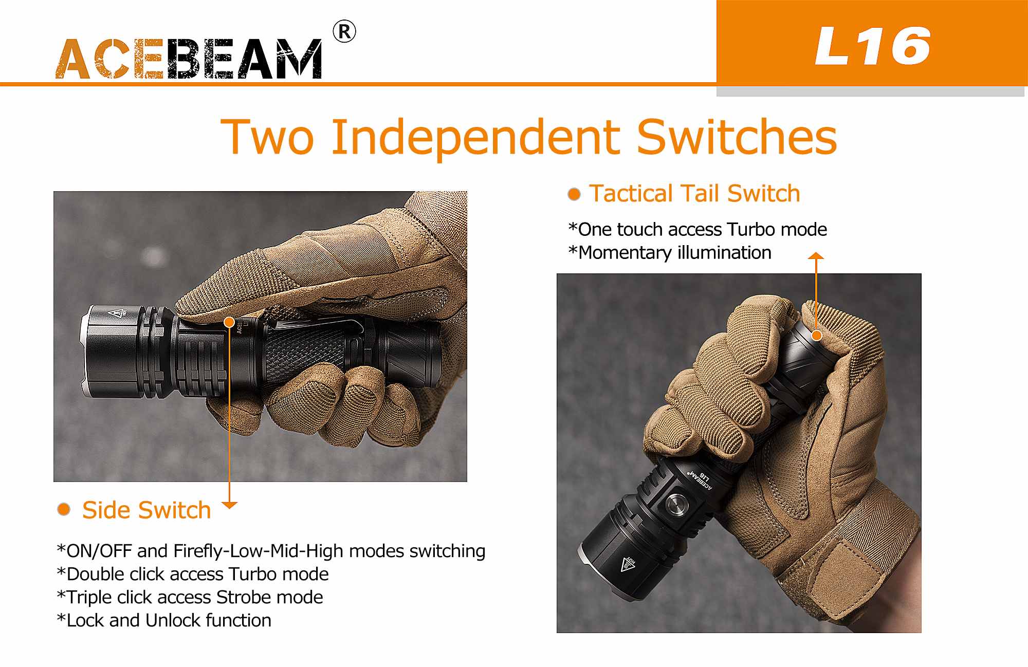 - 戰術尾按:“一鍵Turbo”——按下直接點亮最強光,支持“瞬時點亮”(松手即滅),遇到突發情況時,不用調檔就能快速照明,戰術場景反應速度提升50%;
