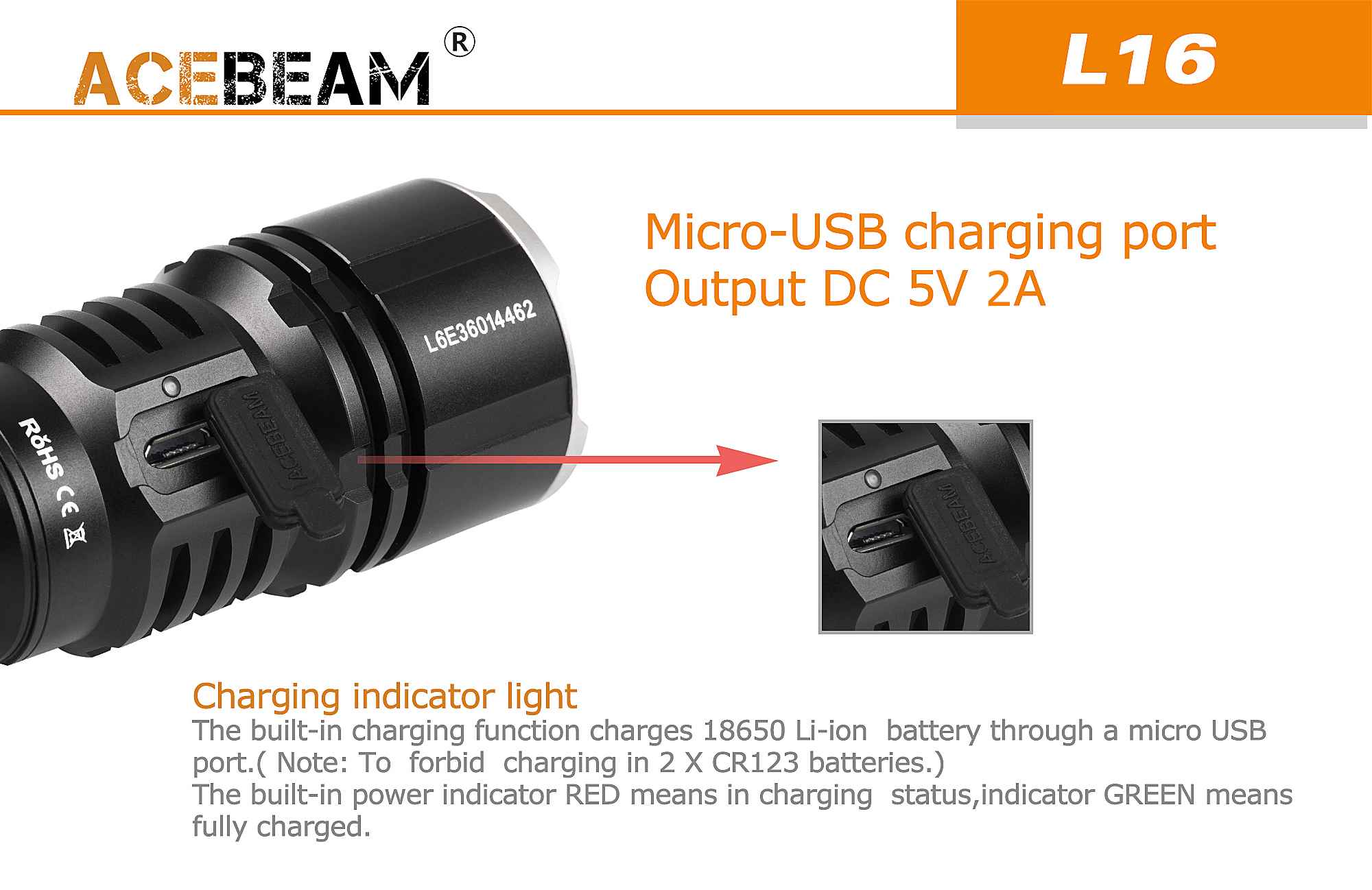 - 用1節18650鋰電池(可通過內置Micro-USB口直充,5V 2A充電效率,紅燈亮表示充電中,綠燈亮即充滿,不用拆電池,超方便);