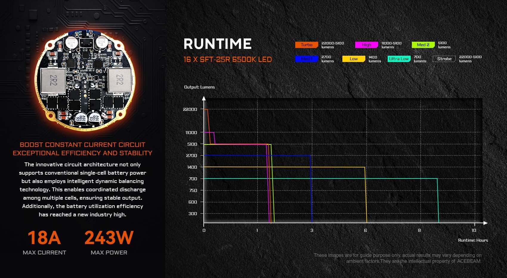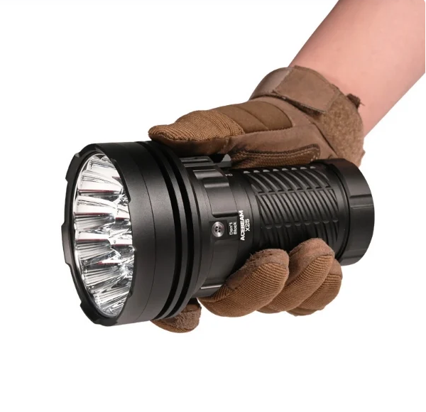 搭載 16 顆 SFT-25R 6500K LED,圓形發光面經光學優化,光線集中度提升 40%,最高 22000 流明(Turbo 模式)如 “移動探照燈”,566256cd 峰值光束強度可穿透黑夜,1505 米射程相當於 1.5 個標準足球場長度,遠距離目標(如山頂信號、海上船只)清晰可見。