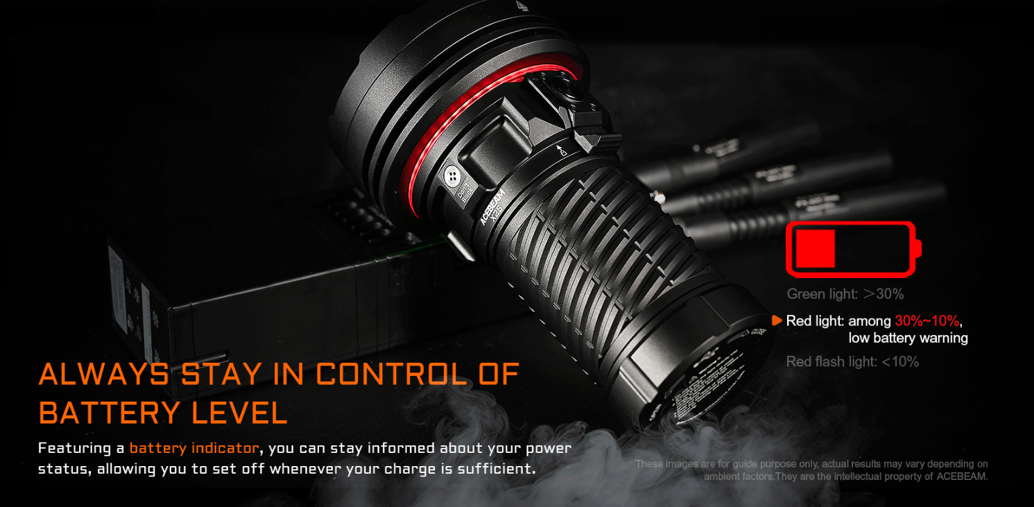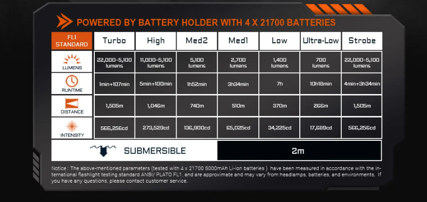 Turbo 模式智能控溫:初始 22000 流明持續 1 分鐘(快速定位目標),自動降至 5100 流明維持 107 分鐘(穩定搜索),避免過熱影響續航;