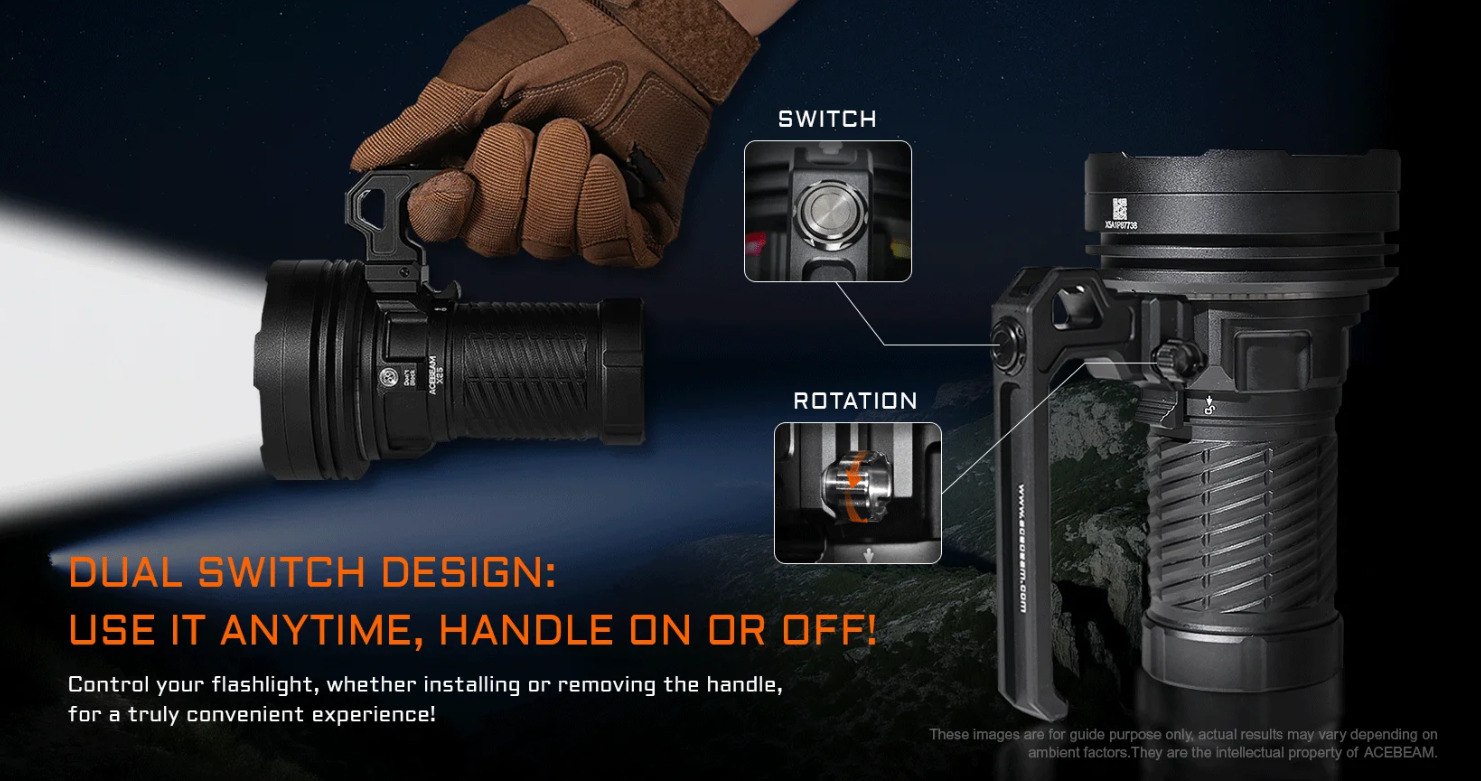 雙開關設計支持旋轉調節,無論安裝或拆卸手柄(適配手持 / 架設兩種使用形態),均可快速切換模式,戴厚重手套也能盲操作,救援時不耽誤時間。