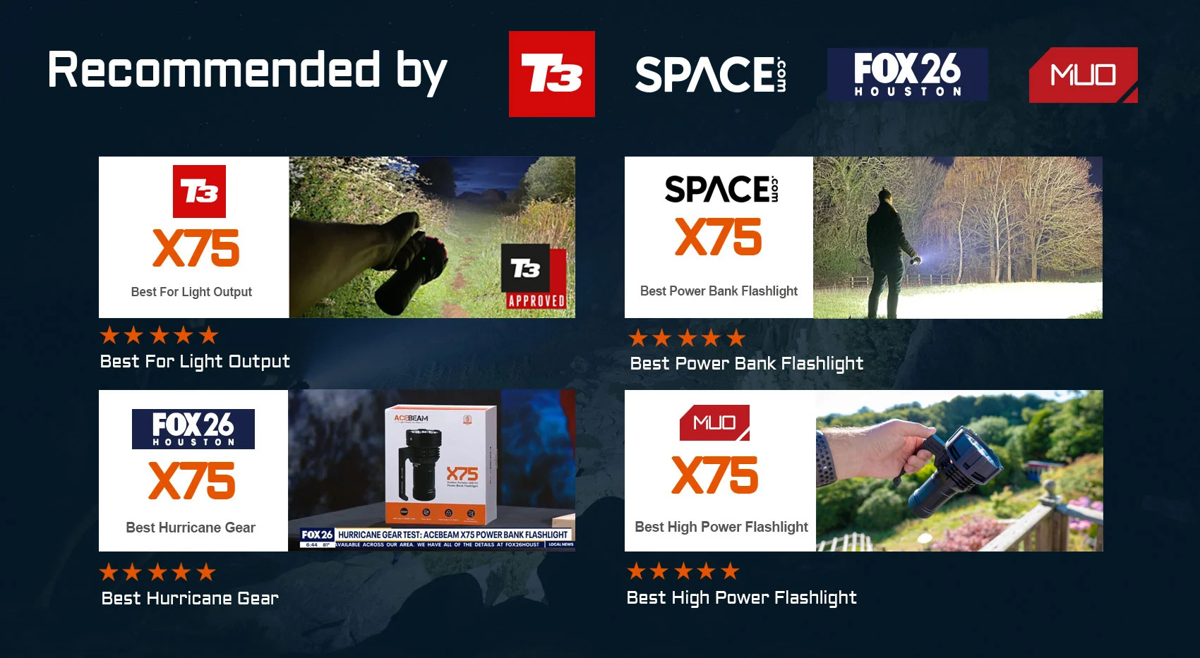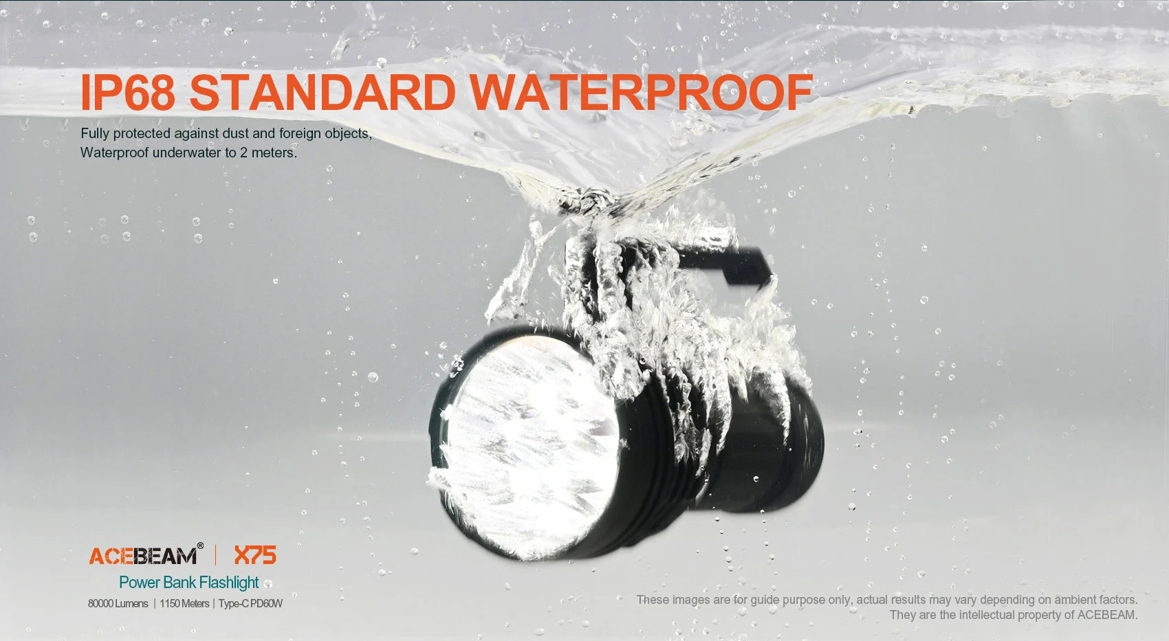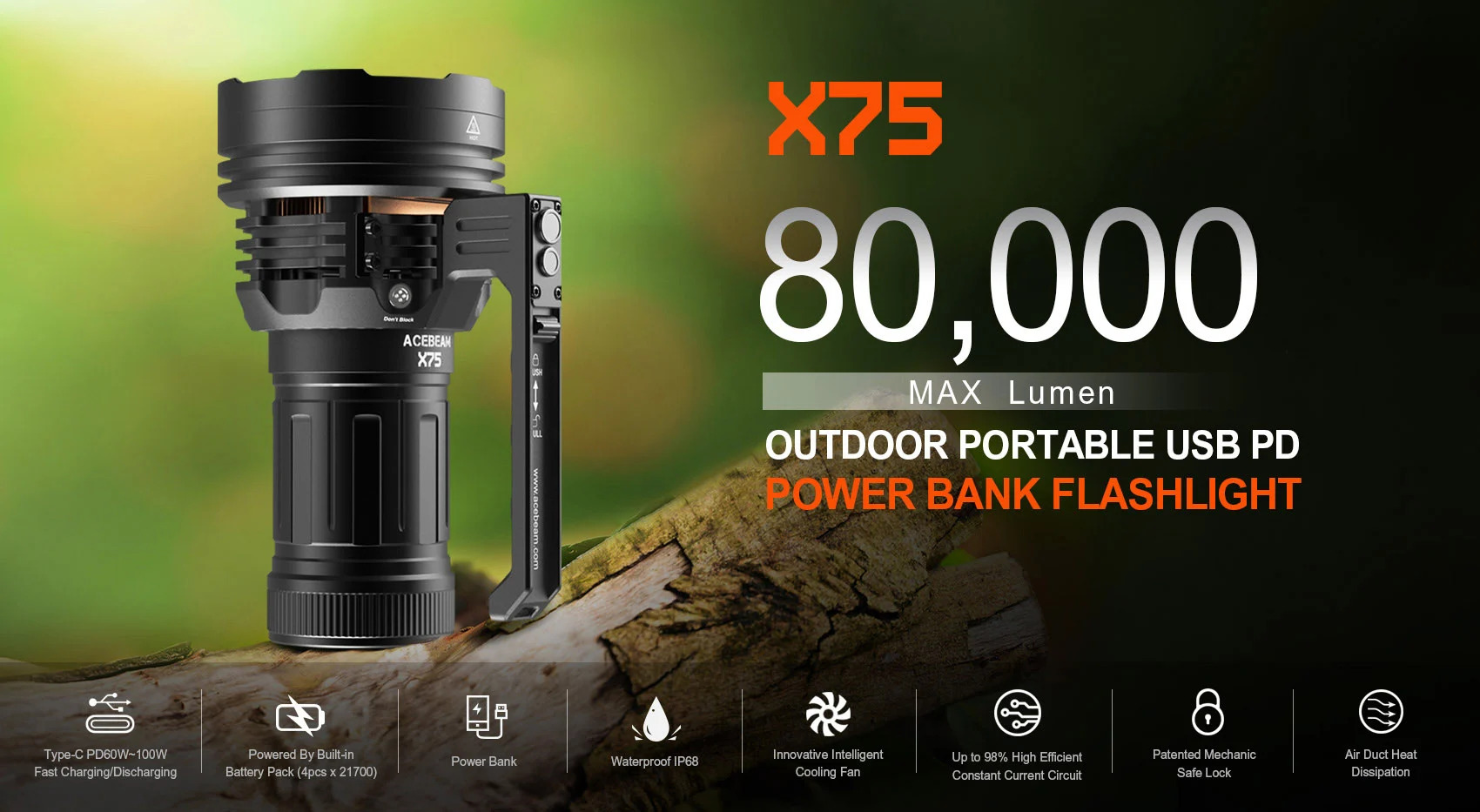 作為Acebeam的旗艦產品,X75是世界上最強大的手電筒之一,也是讓您的生活更輕鬆的終極工具。它擁有高達80,000流明的最大亮度輸出,採用恆流恆壓設計,可在20,000流明下持續照明20分鐘。配備升壓驅動功能,可重複達到最高亮度。科學設計的散熱風扇可拆卸,Acebeam會在您使用一段時間後為您更換。風扇搭配獨特的風道和鏤空散熱結構,確保手電筒能夠長時間穩定運轉。它支援PD60W標準充電,充滿電需要1.5小時;同時相容PD100W快充,只需1小時即可充滿電。此外,它還具備IP68級防水防塵性能,達到最高防護等級。這款手電筒內建4顆21700電池組,兼具行動電源的功能,可作為照明光源使用。雖然X75是一款體積龐大的手電筒,但它的尺寸卻非常適中,方便手持使用。使用這款手電筒是一種極佳的體驗,讓你在下次遇到類似情況時,依然期待著再次使用它。