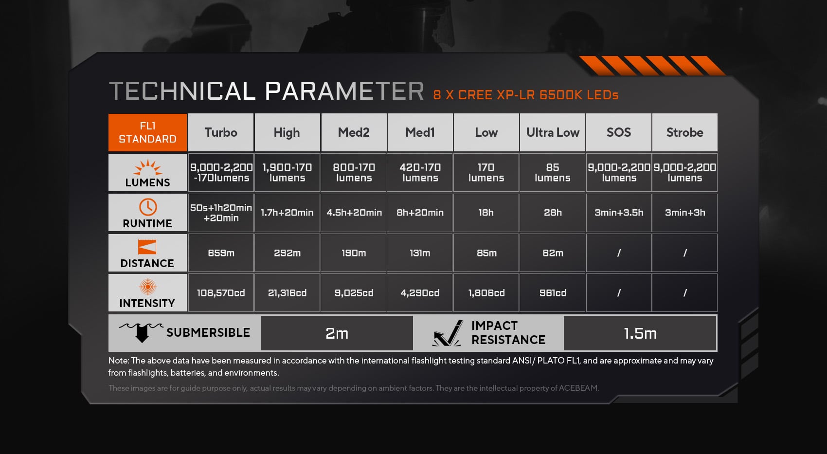 ACEBEAM X20-R 是一款高亮度戰術手電筒,具備三種模式。它採用 8 顆高效能 LED 燈珠,亮度極高,視野清晰,輕鬆穿透黑暗。撥動開關可快速切換工作模式、超低亮度/SOS 模式和戰術模式,為搜救、洞穴探險、巡邏和其他極限活動提供多樣化的照明選擇。 USB-C 介面提供便利的充電方式,內建兩顆 18650 鋰離子電池,可隨時更換,確保長時間戶外使用時不間斷的照明。其緊湊的設計確保舒適穩固的握持感,讓 X20-R 成為您應對任何挑戰的可靠照明解決方案!