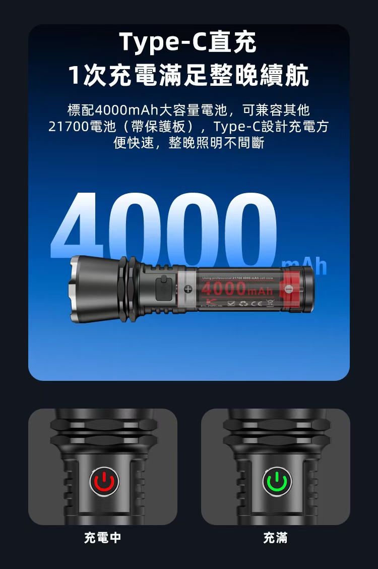 💯【優質電池規格】採用1粒21700,4000mAh大容量【電池市面售價約為$120,現在跟機筒有一粒】