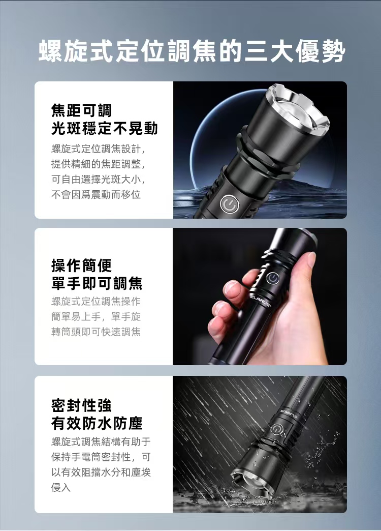 💯螺旋式定位調焦,焦距可調、操作簡便且密封性強。