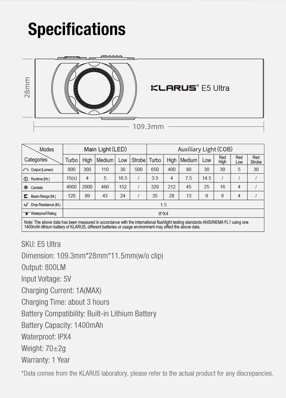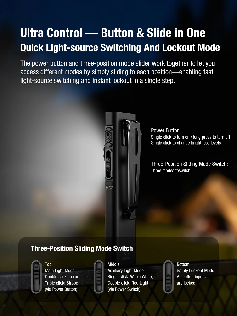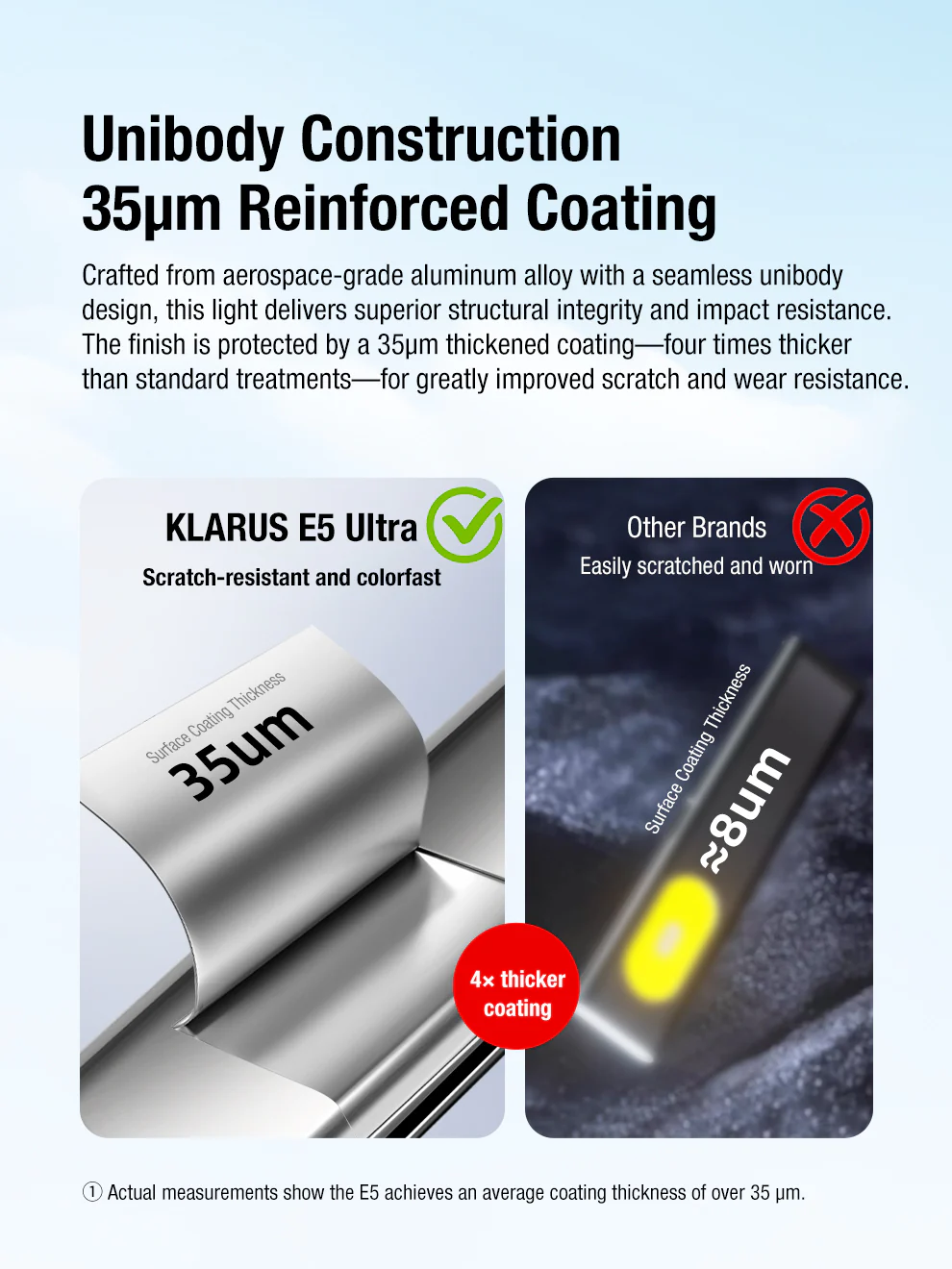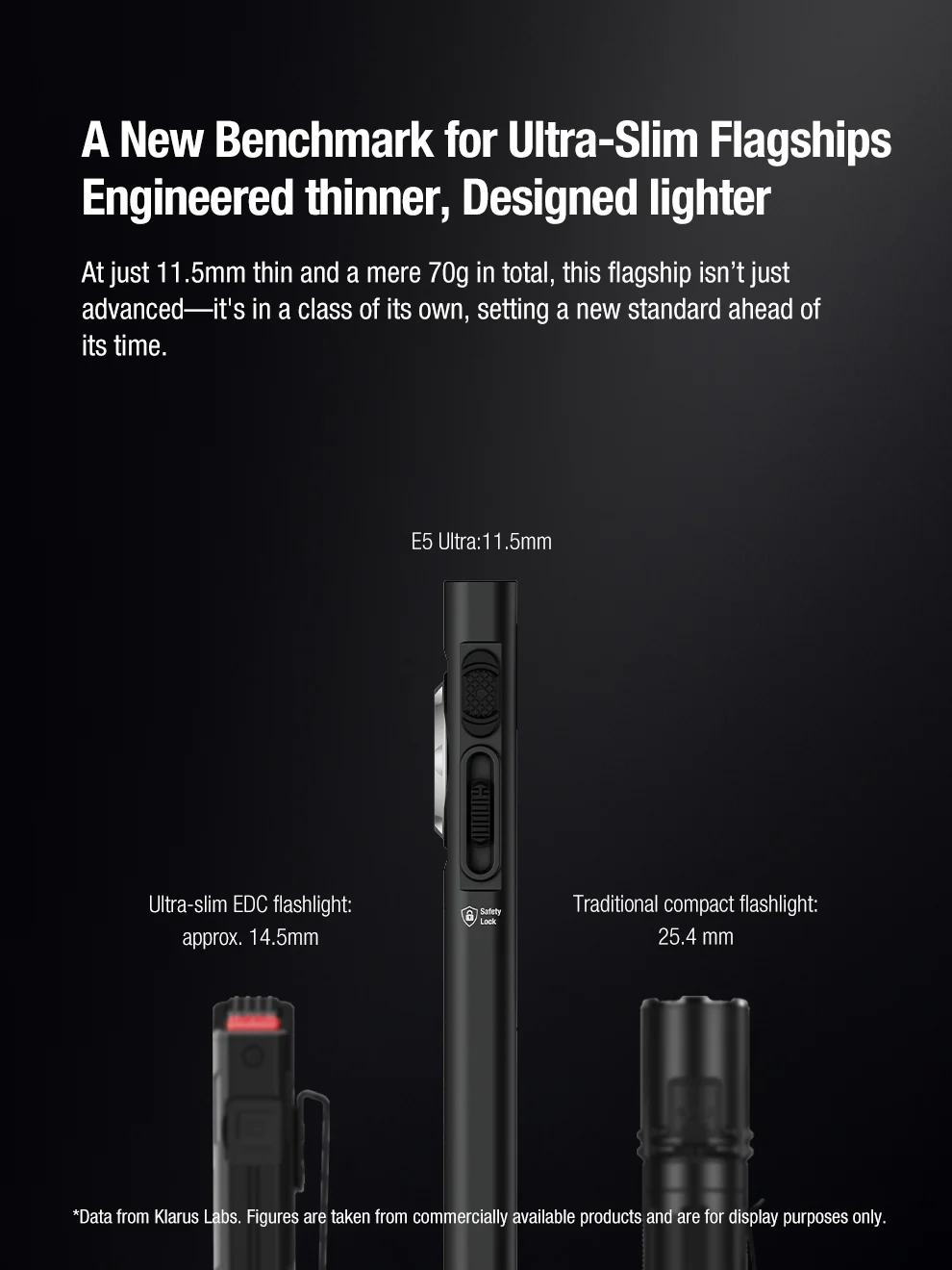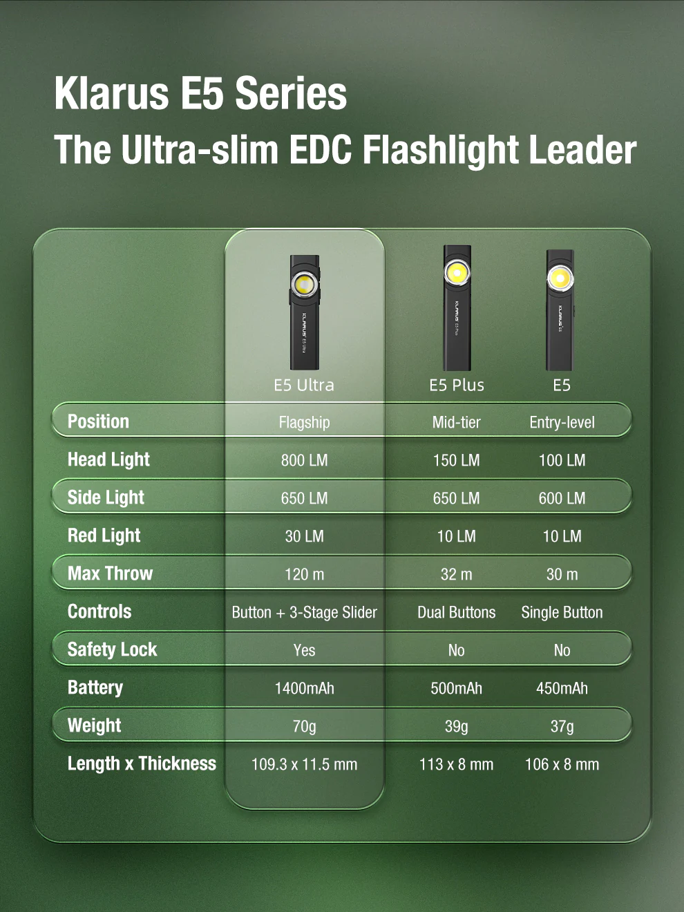 作為E5系列頂配款,對比入門級E5、中端E5 Plus實現全面躍升:亮度從100/150流明飆升至800流明,電池容量從450/500mAh升級到1400mAh(提升75%),操控新增滑動模式開關,防護塗層加厚至35μm(為標準4倍),堪稱超薄EDC手電筒的行業標桿。