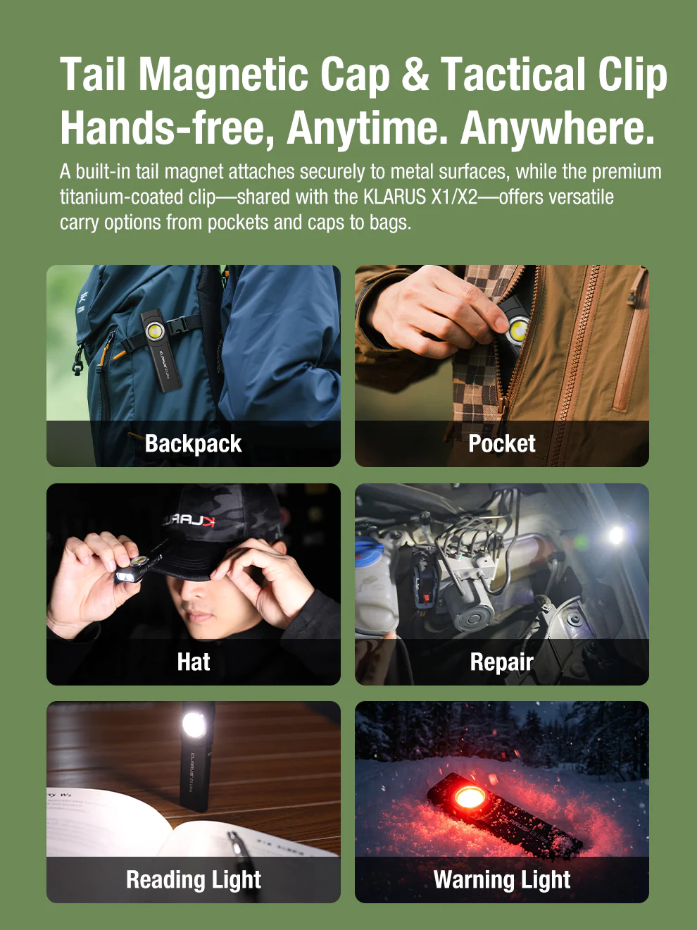 機身厚度僅11.5mm,重量輕至70g,比傳統迷你手電筒更纖薄,手持貼合掌心無負擔,揣進褲袋、塞進錢包都不占地。搭配鈦塗層戰術夾,可夾附口袋、帽檐、背包織帶;尾部內置磁鐵,能吸附在汽車、金屬工具表面,解放雙手適配維修、露營等需固定照明的場景,攜帶靈活性拉滿。