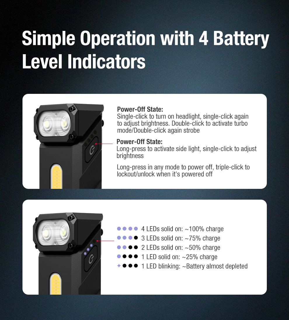 關機狀態下單擊開主燈並調節亮度,雙擊啟動 Turbo / 爆閃;長按開側燈並調節亮度;任意模式長按關機,關機時三擊鎖定 / 解鎖(防止誤觸耗電),新手也能快速上手。