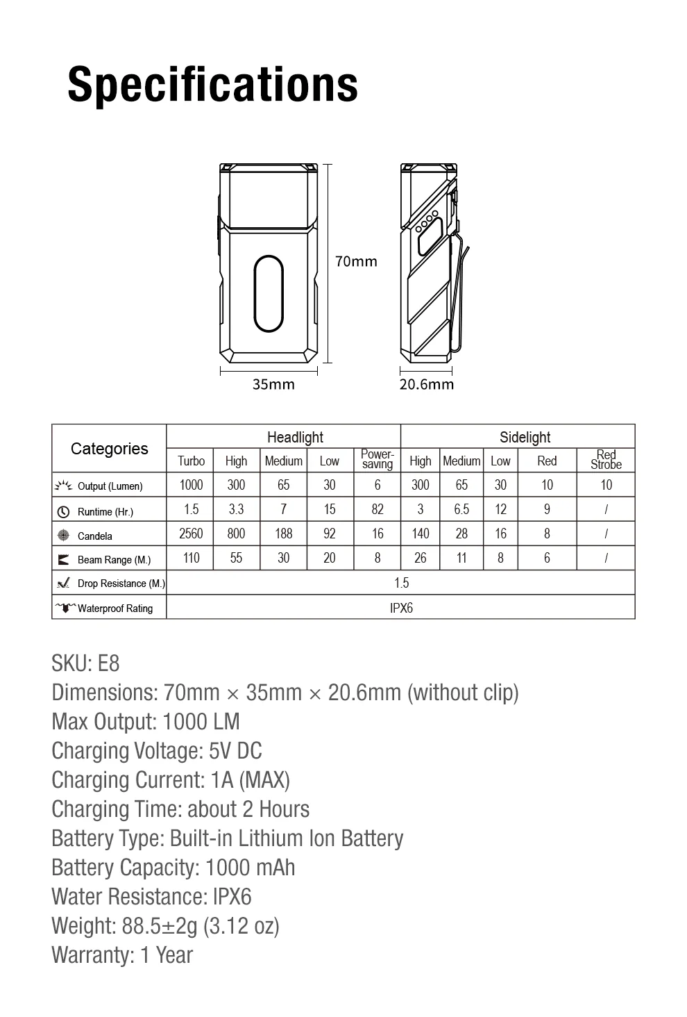 主燈:雙三星 LH351 LEDs 冷白光,峰值亮度 1000 流明,射程 110 米(相當於一個標準足球場長度),聚光與泛光結合,適合遠距離搜索、戶外探險等場景;