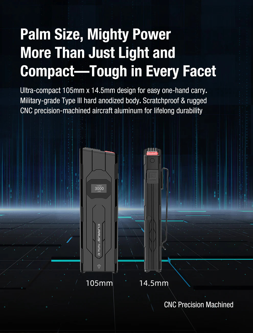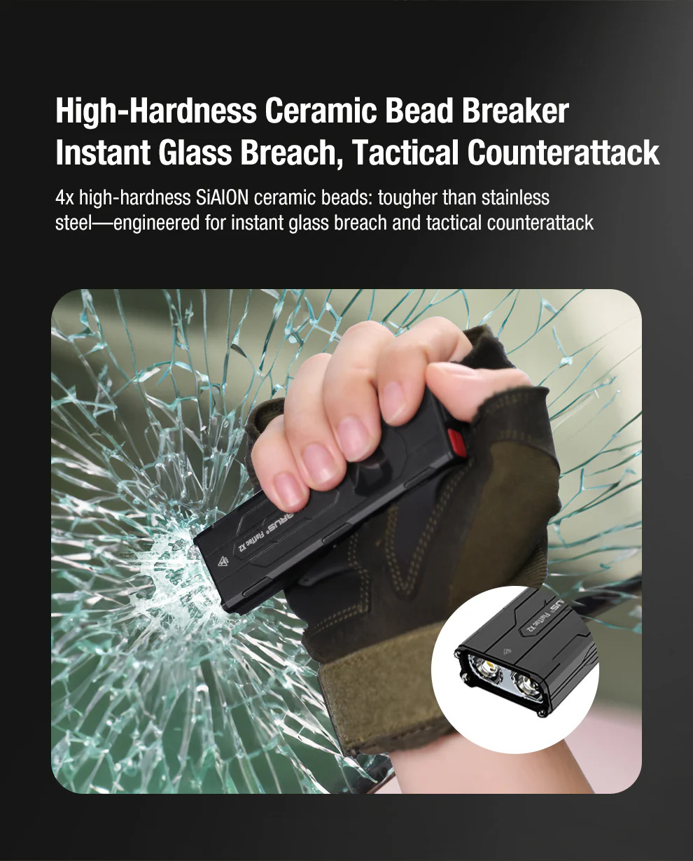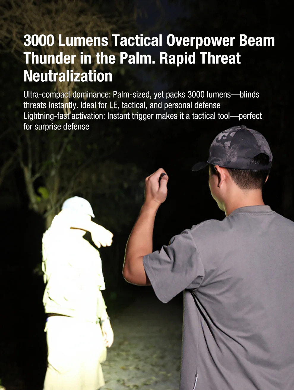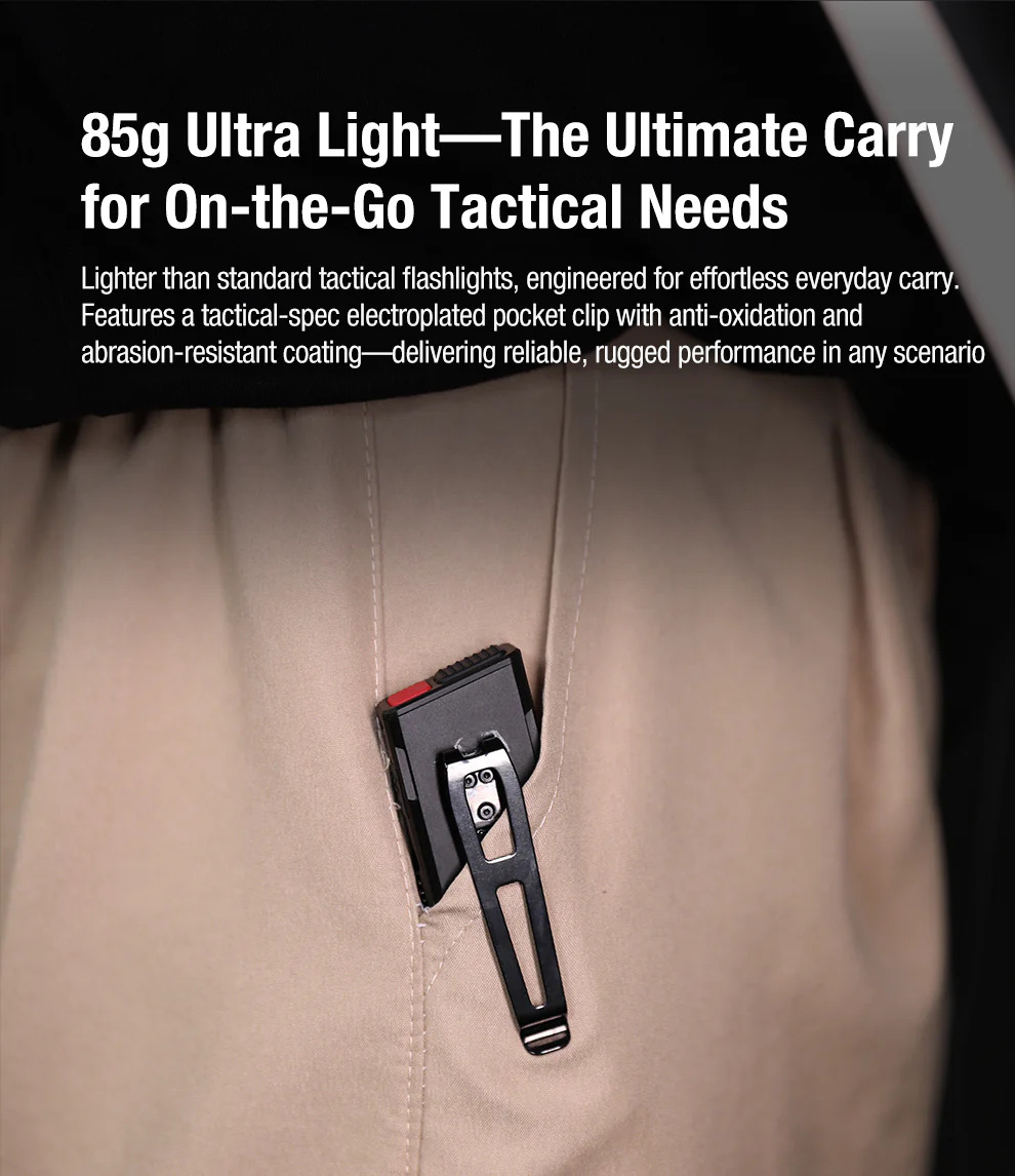 - 輔助開關:控製瞬時Turbo模式(緊急強光)+ 一鍵爆閃(戰術壓製)+ 雙擊SOS(求救信號),操作邏輯簡潔,黑暗中盲操作無壓力,戰術響應速度比普通手電提升40%。