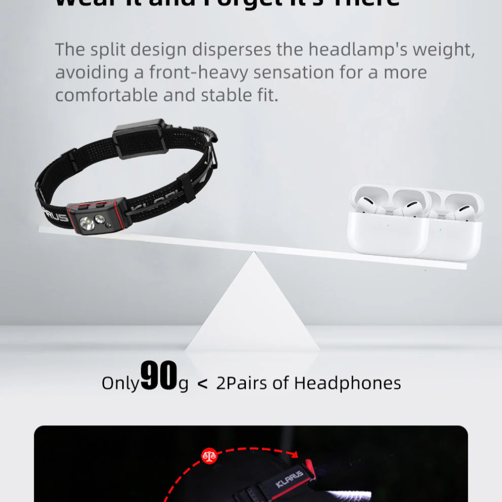 💯 分離式減重結構,主燈與電池盒分離設計,重量均勻分散至頭部兩側,長時間佩戴無壓感(整體重量僅 180g,比傳統頭燈輕 40%)。