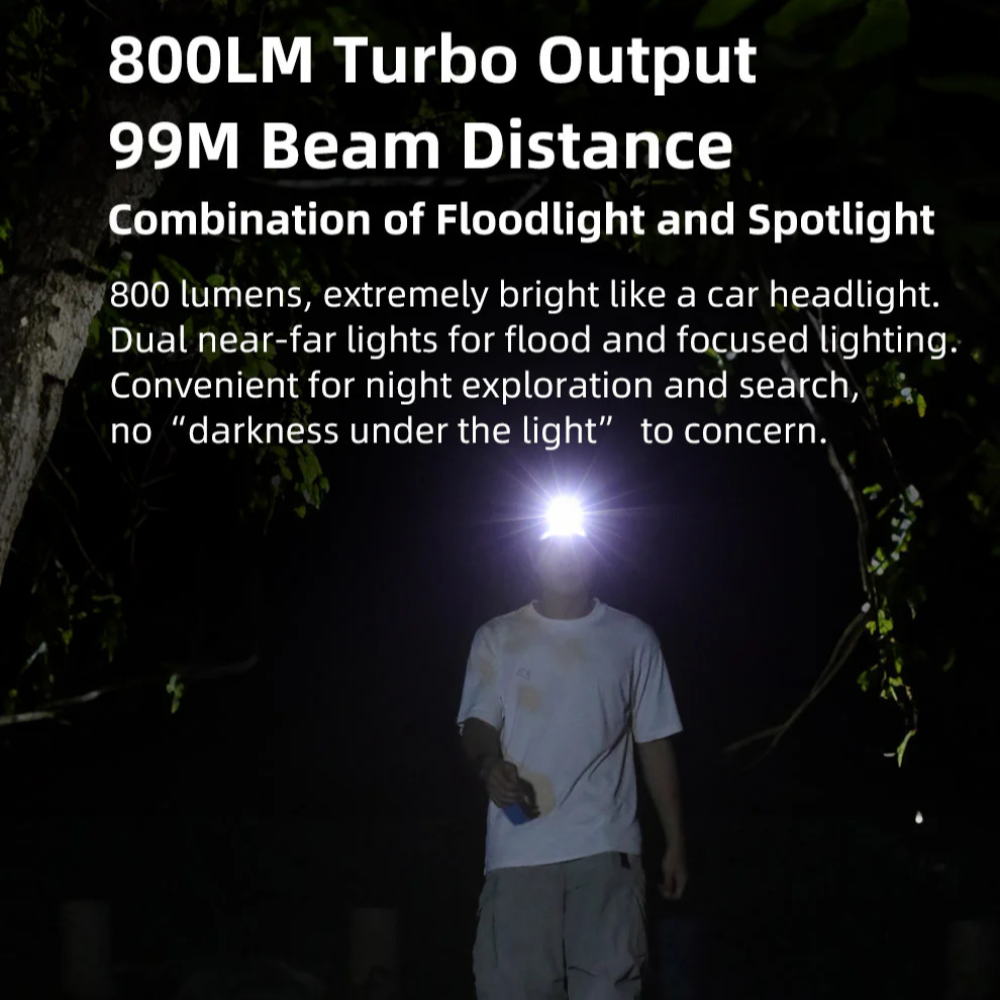 💯 800 流明渦輪強光系統,搭載 Cree XHP70.2 發光晶片,渦輪模式輸出 800 流明強光,光束距離達 99 公尺,泛光 + 聚光雙燈組合實現「遠距照明 + 近場鋪光」一體化,適配登山、夜跑、露營等全場景。