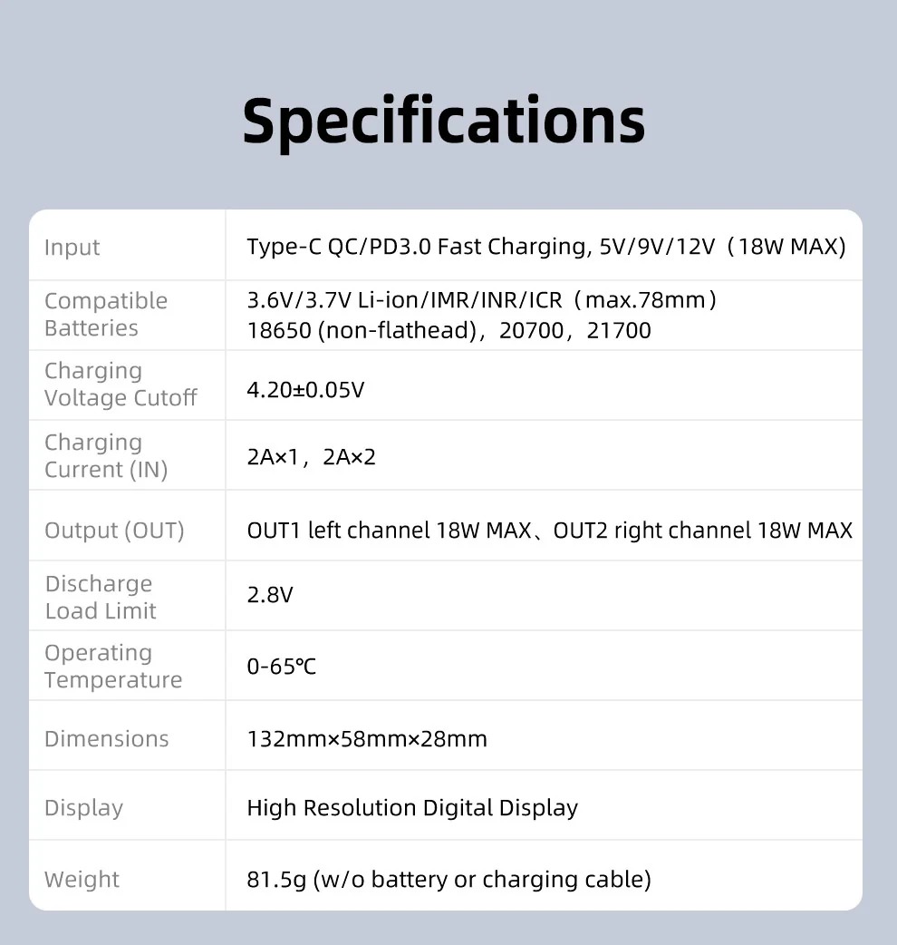 💯【廣泛電池相容】能夠相容於3.6V/3.7V 鋰離子/IMR/INR/ICR(最大78mm)的18650(非平頭)、20700、21700 電池,無論是帶保護電路還是無保護電路的21700 電池都可使用。這種廣泛的兼容性,使其適用於眾多不同品牌和型號的電池,為用戶提供了極大的便利,無需擔心電池不匹配的問題,輕鬆管理各類鋰離子電池。