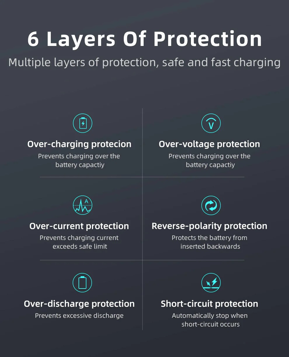 💯【多重安全防護】具備 6 層全面的保護機制,包括過充保護、過壓保護、過電流保護、反接保護、過放保護和短路保護。在充電過程中,無論是面對電壓過高、電流過大、電池反接或其他異常情況,都能迅速啟動相應保護措施,確保安全快速充電,有效避免因充電問題導致的設備損壞或安全事故,為您和您的設備保駕護航。同時,也可對過放電的鋰電池進行「0」伏特啟動和修復,延長電池使用壽命,降低電池更換成本。