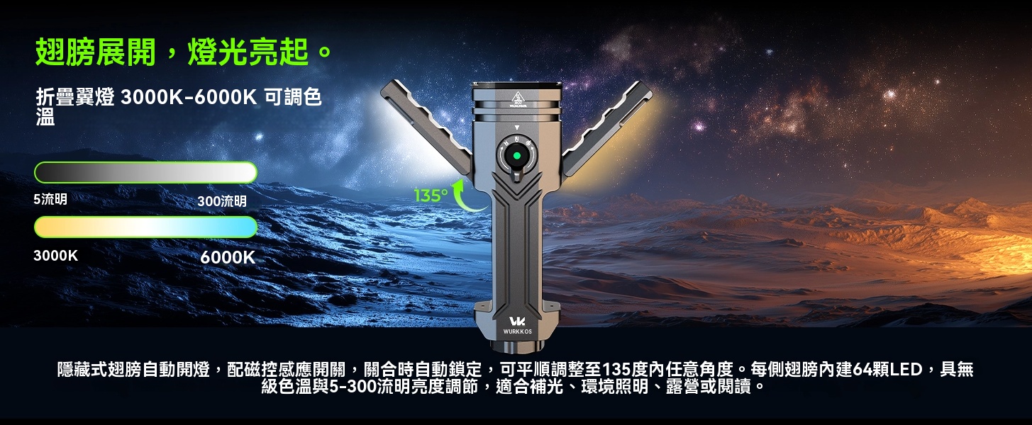 - 折疊翼側燈(近距離環境光):每側64顆LED,燈翼支持135°任意角度折疊,展開即亮。3000K-6000K冷暖色溫可調+5-300流明無級調光,最低5流明續航140小時,露營氛圍照明、夜間維修補光、睡前閱讀都適配,光線柔和不刺眼。