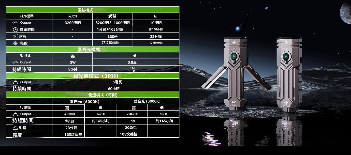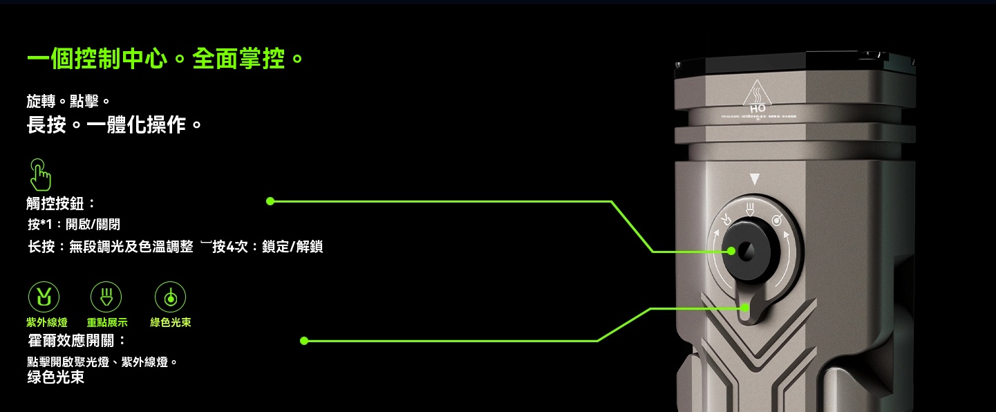 - 霍爾效應開關:快速切換聚光燈、紫外燈、綠色光束,無需繁瑣檔位循環,戶外緊急場景下也能精準切換光源。